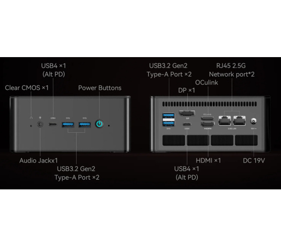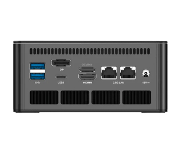 Поддержка оперативной памяти и накопителей осталась прежней: два слота DDR5-5600 (до 96 ГБ) и два слота M.2 2280 для NVMe SSD с интерфейсом PCIe 4.0. Набор портов также практически идентичен модели UM780 XTX и включает 4x USB-A 3.2 Gen 2, 2x USB4, выходы DP и HDMI, аудиоразъемы и два порта 2.5 GbE, а также, в отличие от UM790 Pro, порт OCulink.